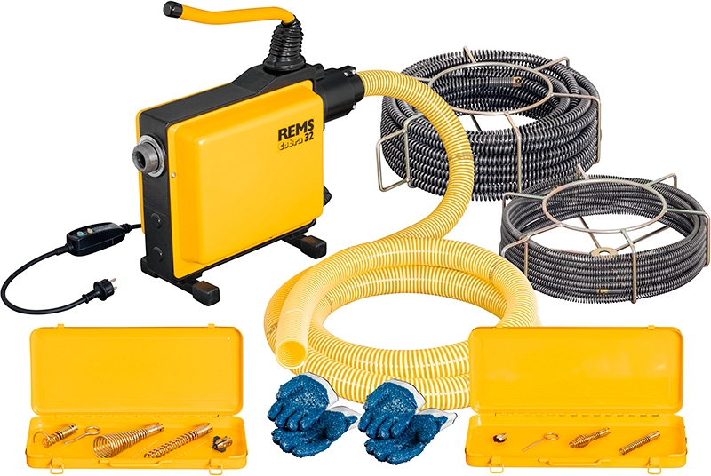 - Rems Кобра 32 Сет 16+22. Электрическая машина для прочистки труб Ø 20 – 250 мм. Приводной двигатель с не требующим технического обслуживания конденсаторным двигателем 230 В, 50 Гц, 1050 Вт, правый и левый ход. Направляющая. Кабель со встроенным выключателем безопасности (PRCD). С комплектом спиралей и инструмента 16 мм: 5 частей спиралей 16 мм × 2,3 м в корзине, 2 зажимных кулачка 16 мм, прямой бур 16 мм, бугорчатый бур 16 мм, зубчатый лепестковый бур 16/25 мм, разделительный штифт 16 мм, 1 пара перчаток, прочный стальной чемодан для насадок. С комплектом спиралей и инструмента 22 мм: 5 частей спиралей 22 мм × 4,5 м в корзине, прямой бур 22 мм, возвратный бур 22 мм, конусный бур 22 мм, зубчатый, лепестковый бур 22/35 мм, разделительный штифт 22/32 мм, 1 пара перчаток, прочный стальной чемодан для насадок. В коробке.