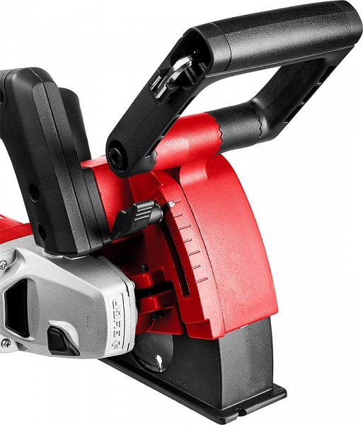 - Бесступенчатая регулировка глубины пропила с удобной шкалой и фиксацией без дополнительного инструмента