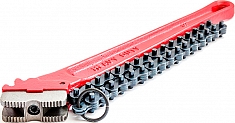 - На щеку нанесены специальные насечки-зубья, которые плотно обхватывают трубу и не позволяют ей прокручиваться, являются опорой для рукоятки: зубья с 2-х сторон для работы по типу трещотки – правый и левый ход